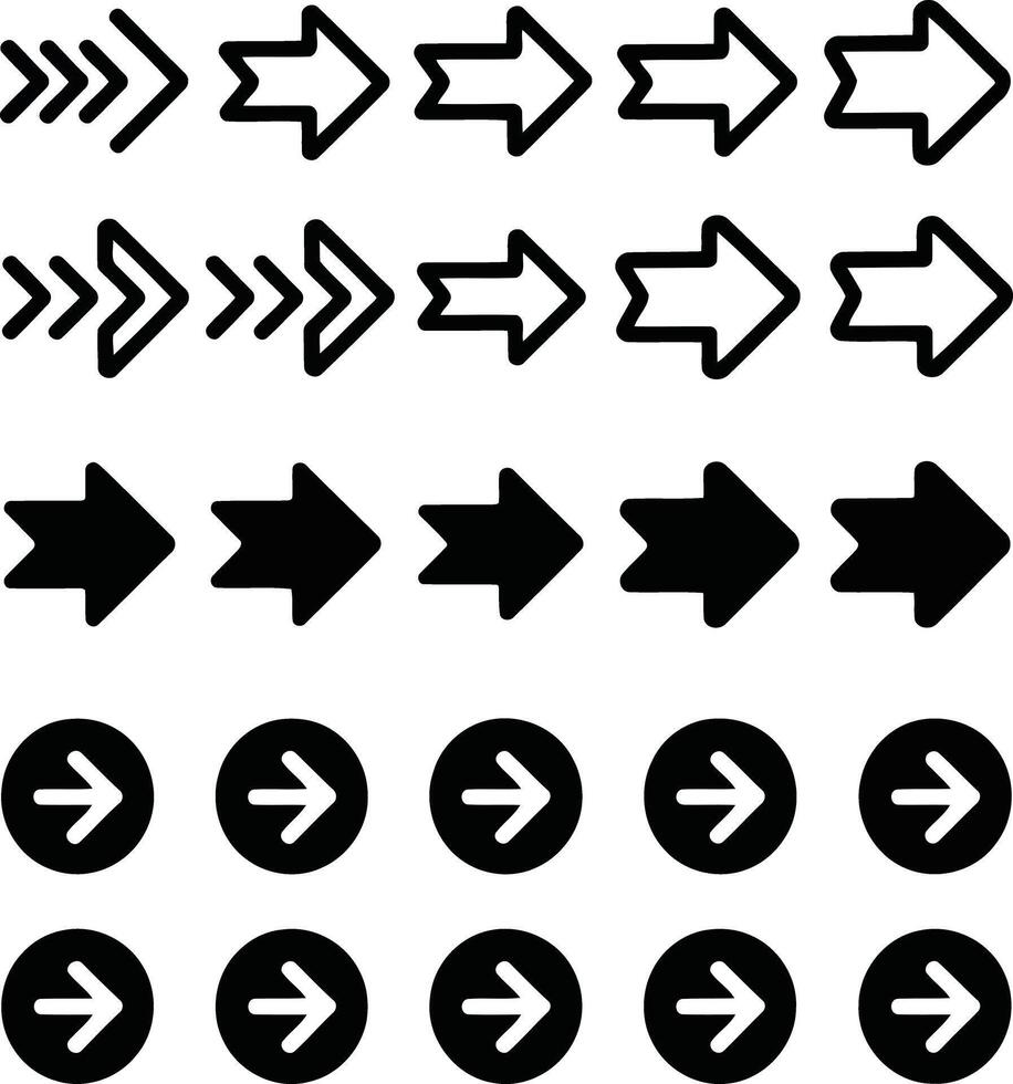Comprehensive set of arrow icons with diverse styles, including solid, outlined, and circular designs on white illustration Pro Vector