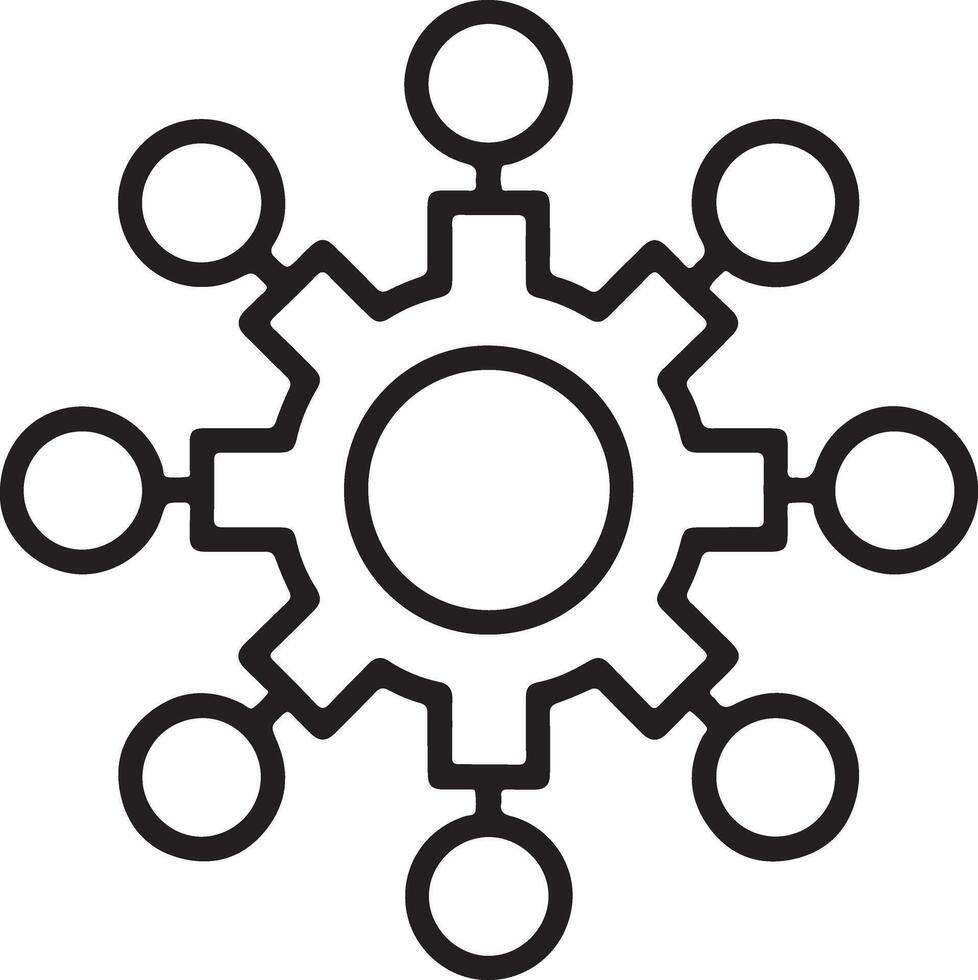 Abstract representation of a central gear connected to multiple smaller circles symbolizing network or system integration Pro Vector