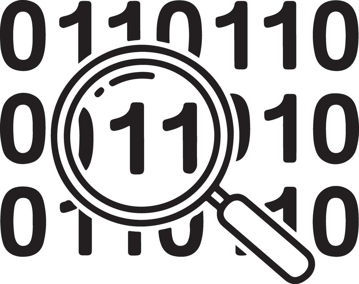 Magnifying glass examining binary code highlighting a specific sequence of ones and zeros Pro Vector