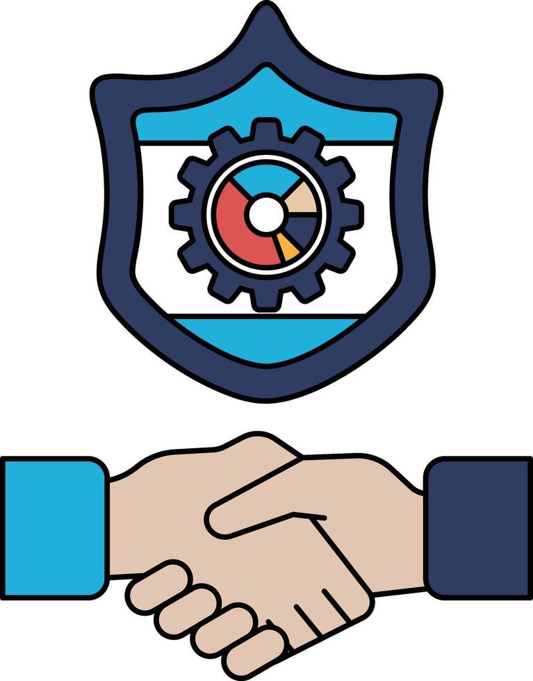 A black and white drawing of two hands shaking hands in front of a shield with a Pro Vector