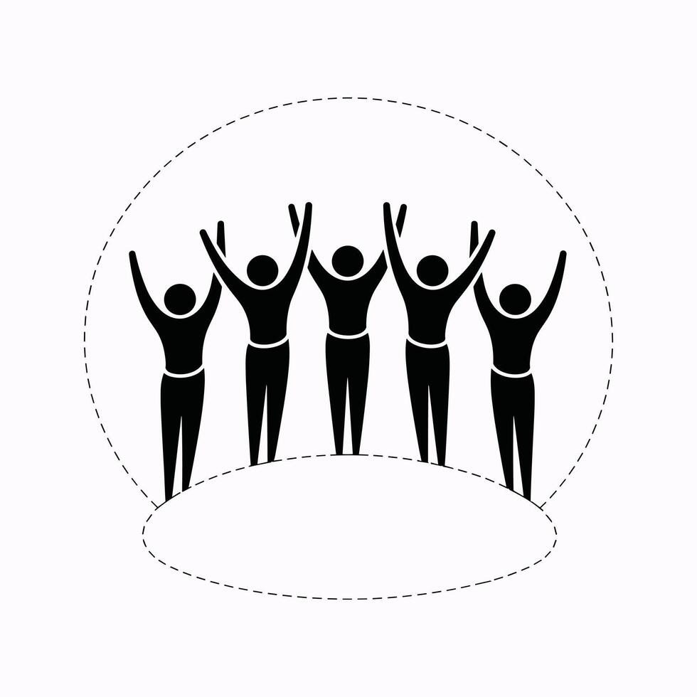 Five Black Stick Figures With Raised Arms In Circle On White Keywords people, group, unity, teamwork Pro Vector