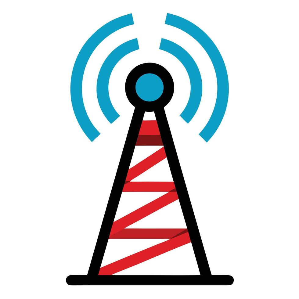 Cell Tower Icon with Red Stripes and Blue Signal Waves communication network Pro Vector