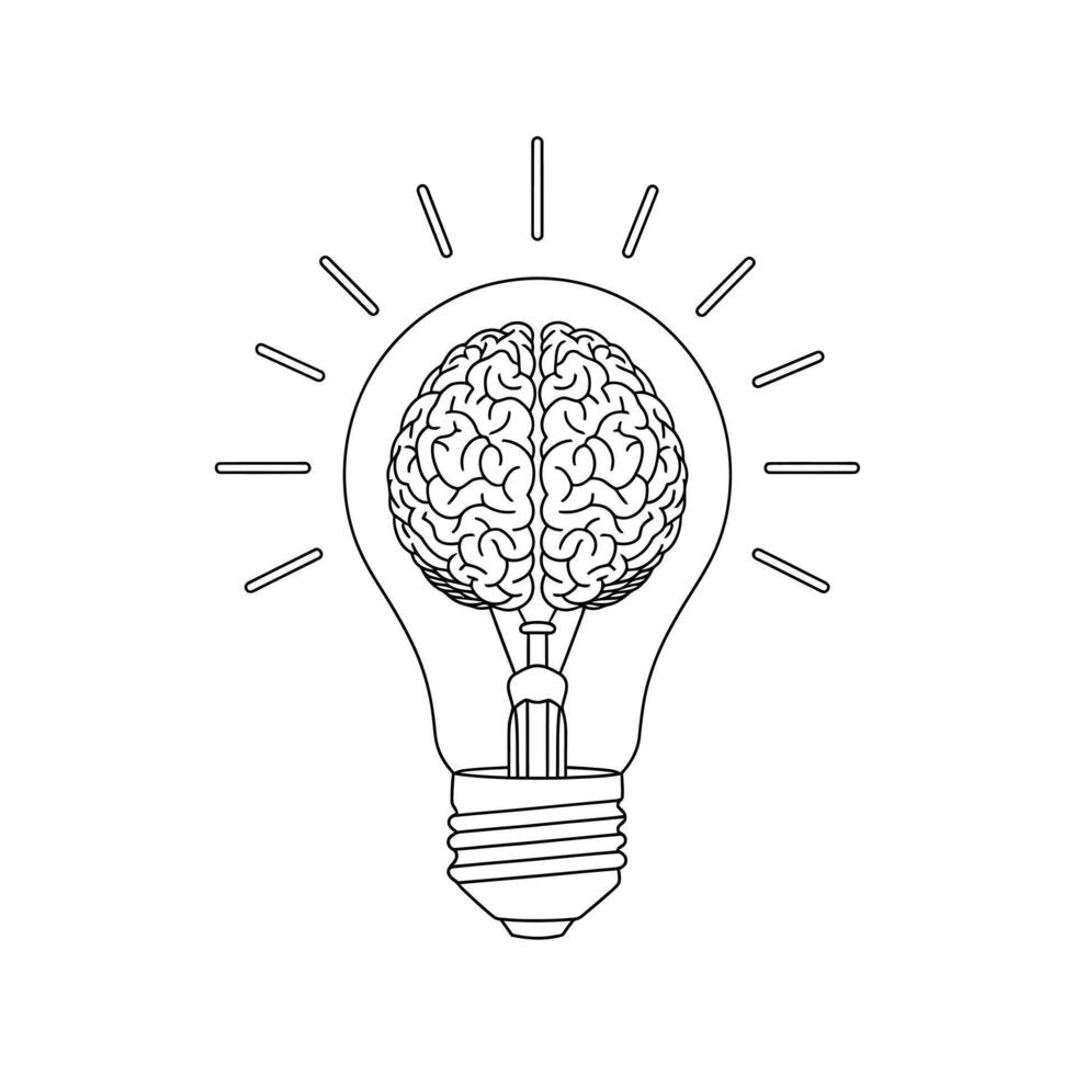Outline Illustration of a Light Bulb Containing a Human Brain with Rays on White Background idea Pro Vector