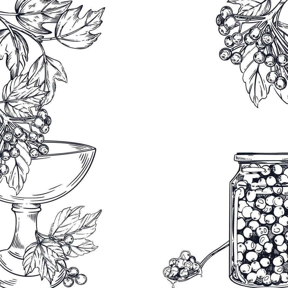 A square frame of berries and viburnum leaves, a jar of jam with viburnum, a spoon with jam and a bowl for jam. All objects are hand-drawn with ink. For printing on food, Pro Vector