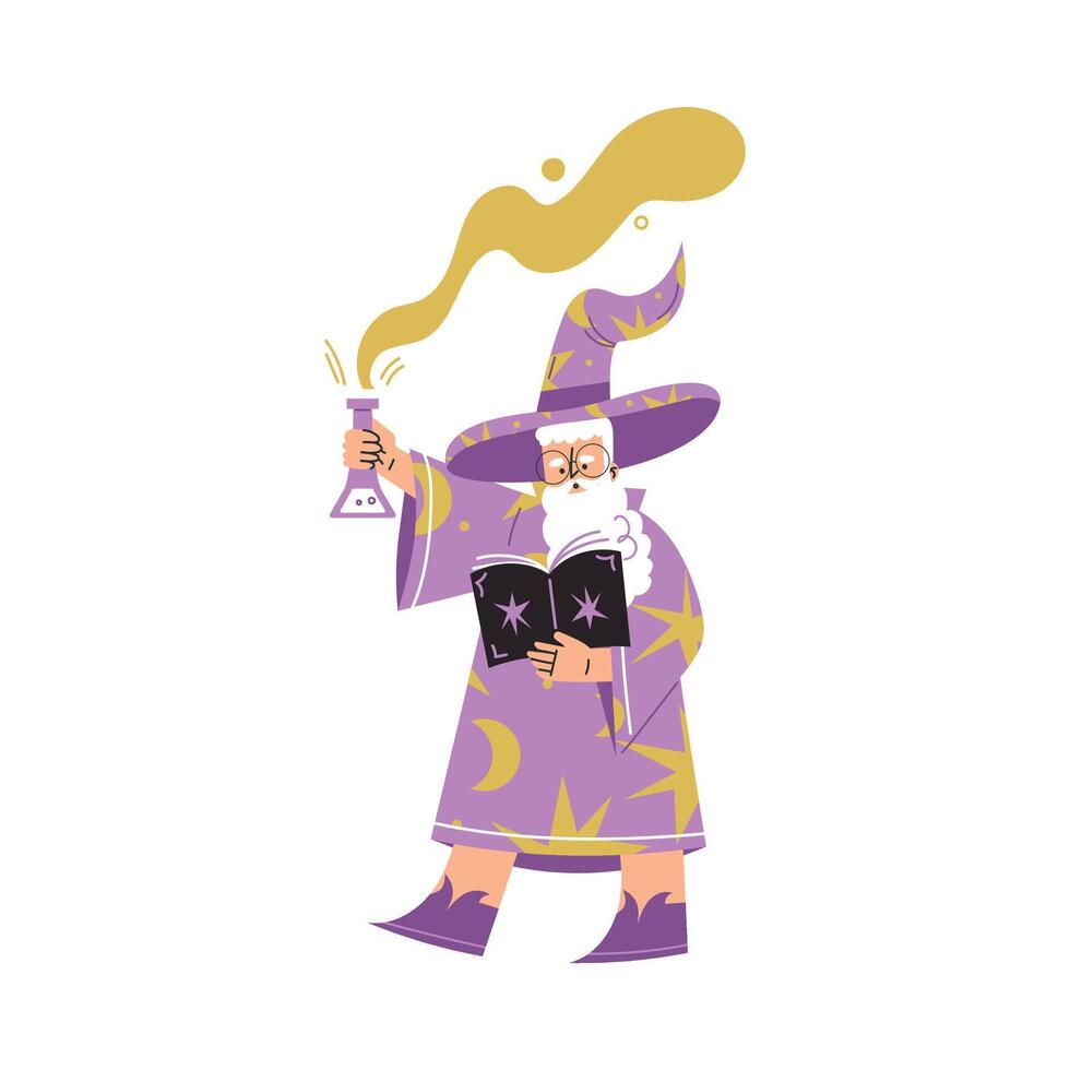Wizard Man Character in Purple Gown and Hat with Book and Flask Illustration Pro Vector
