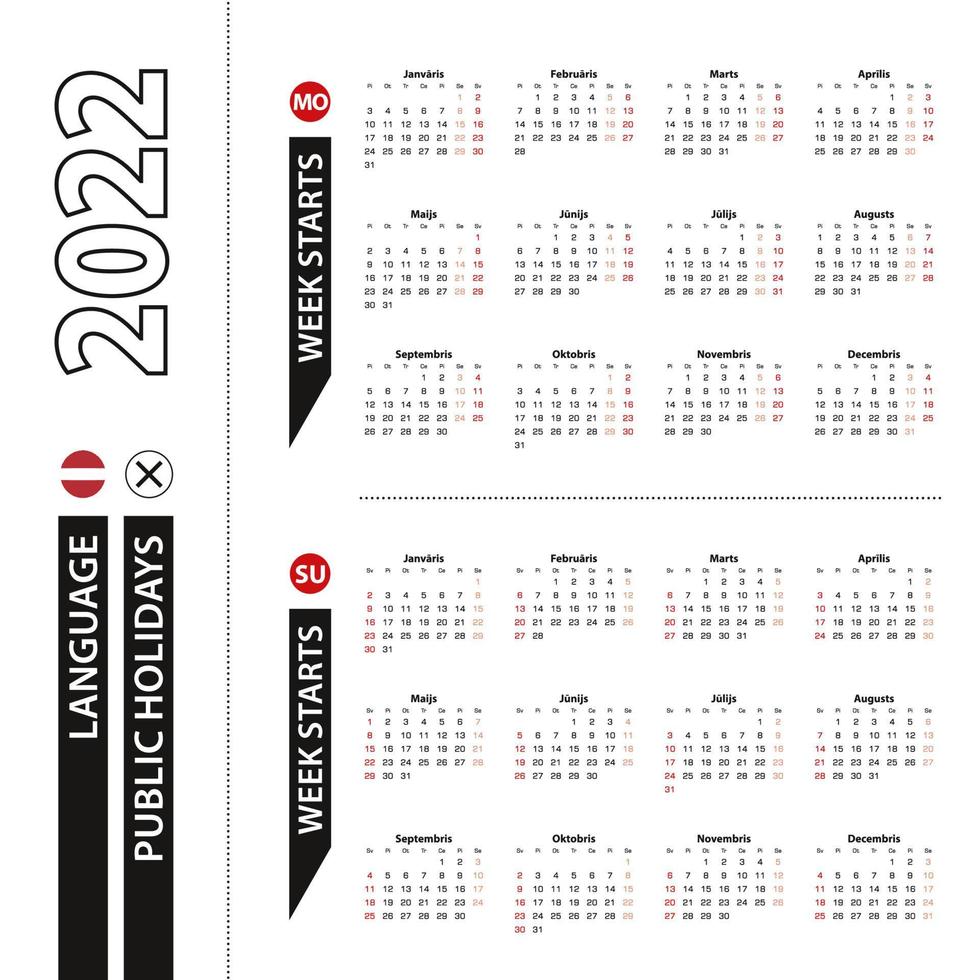 Two versions of 2022 calendar in Latvian, week starts from Monday and week starts from Sunday. Pro Vector