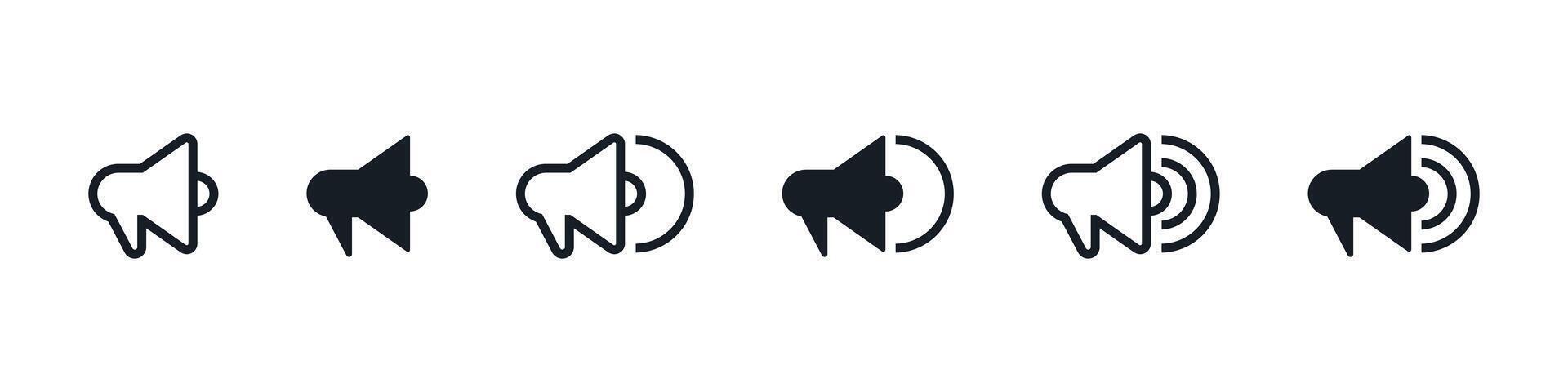 Sound volume icon. Audio speaker with mute, low, medium and high volume levels illustration. Media control and system settings symbol. User interface sound adjustment sign pictogram. Pro Vector