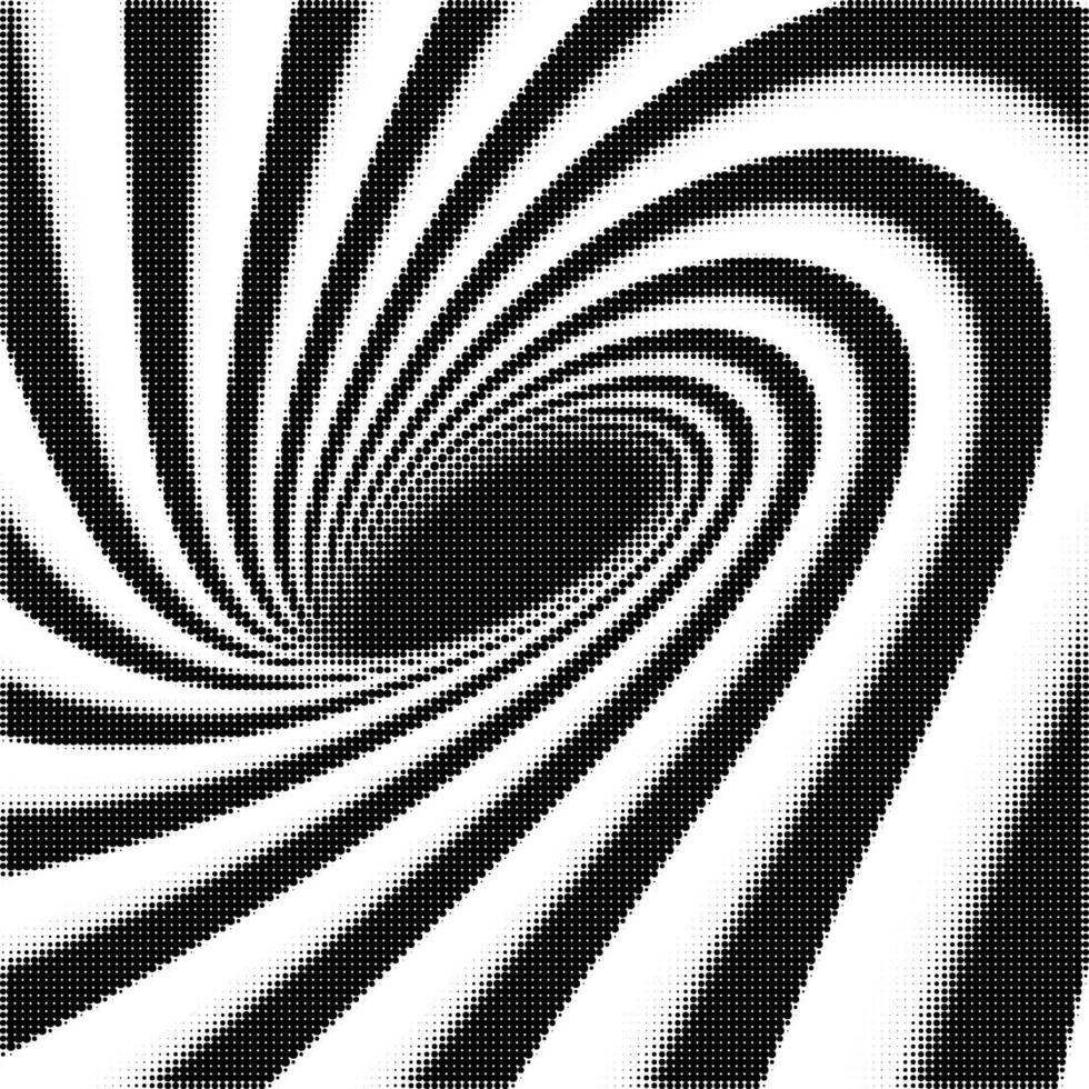 Abstract black and white halftone swirl. Optical illusion vortex with curved dynamic lines, retro op-art style background. Pro Vector