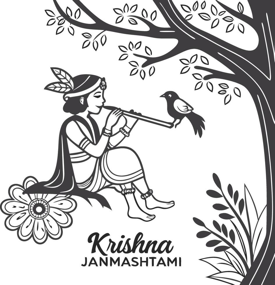 Lord Krishna playing flute under a tree with a bird Free Vector