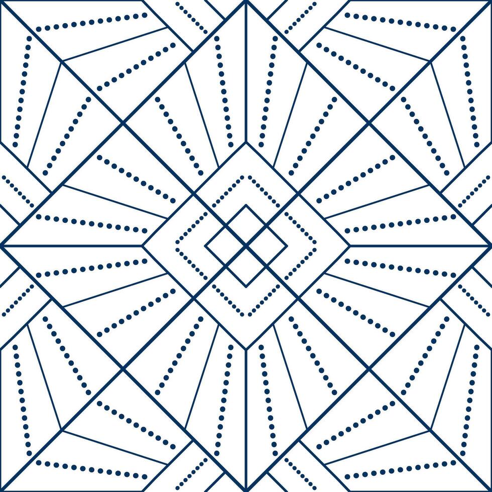 Seamless geometric pattern from lines and dots. Square diagonal ornament. Blue pattern on white background. Strict monochrome design. Mosaic tile background Pro Vector