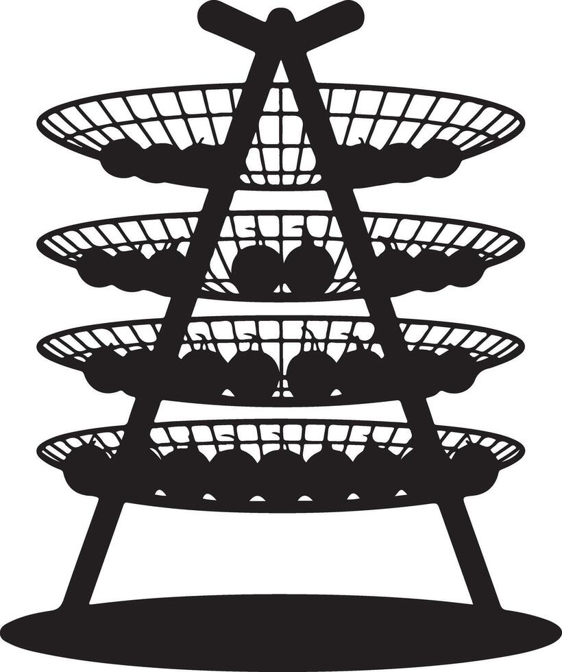 Black silhouette of a four tier wire display stand filled with round objects isolated on white background vector