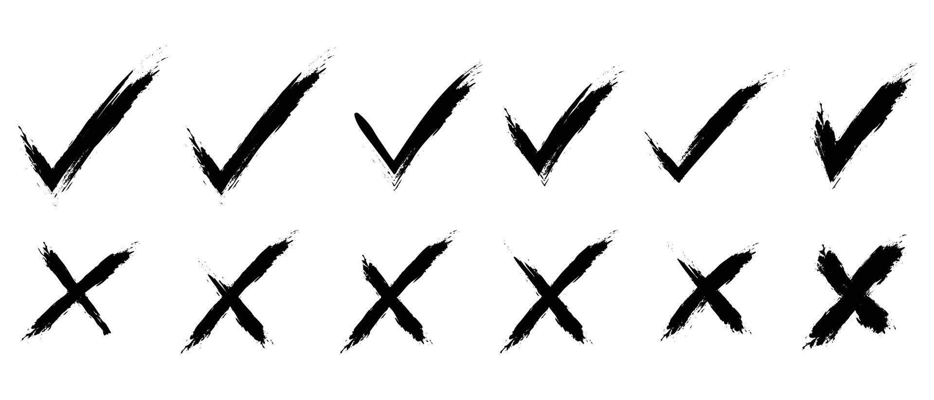 Dirty grunge hand drawn brush stroke set with cross X and tick V check marks. Rough symbols for YES and NO, voting boxes, web buttons, validation, approval or rejection icons. Pro Vector