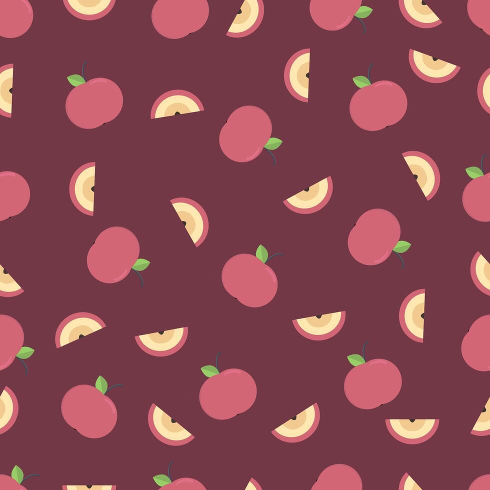 Seamless fruit pattern featuring whole apples and cross-sections on a deep maroon background. Ideal for autumn-themed textiles, kitchen decor, wrapping paper, and educational materials. Pro Vector