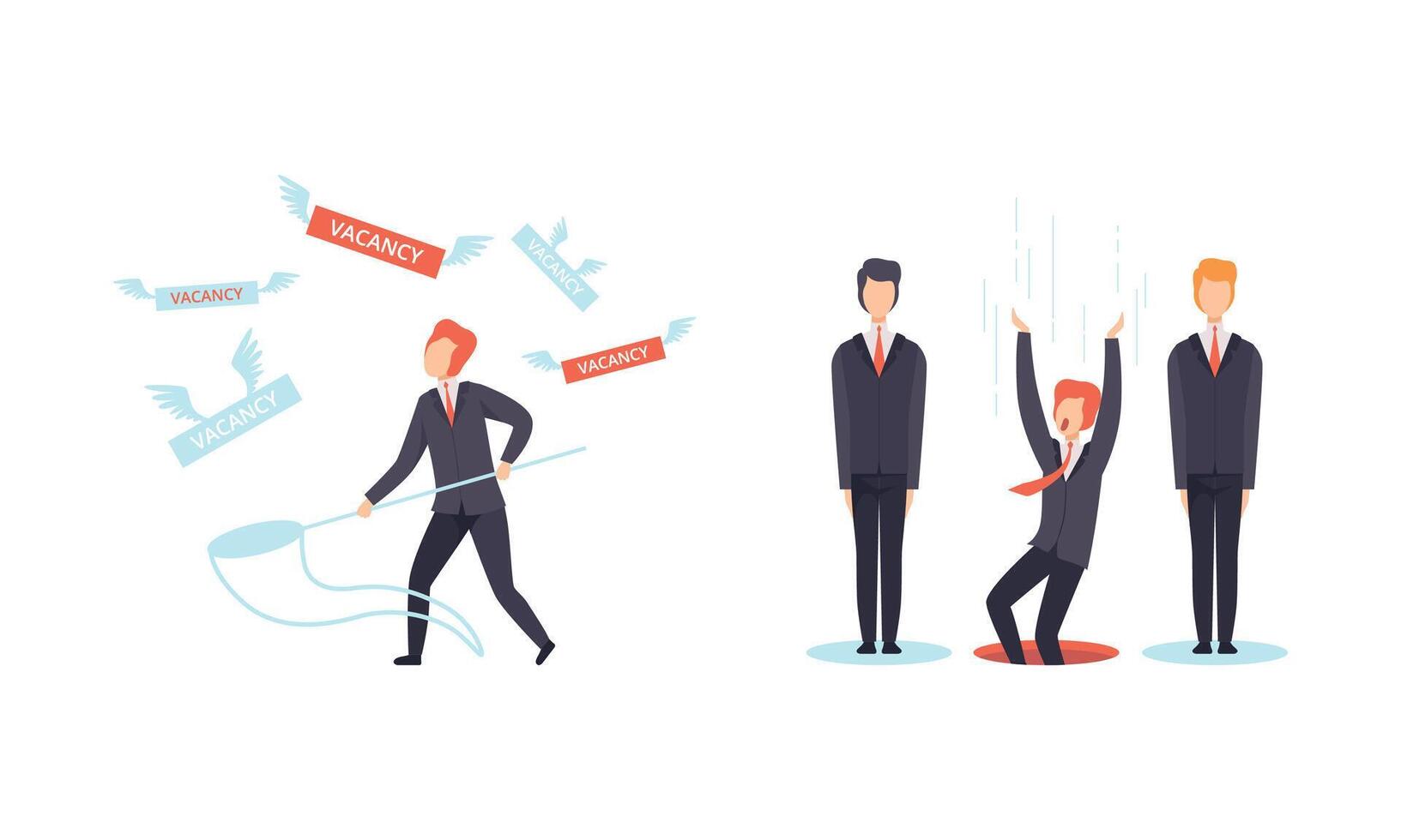 Man Character Searching for Job Standing with Catching Net Set Pro Vector