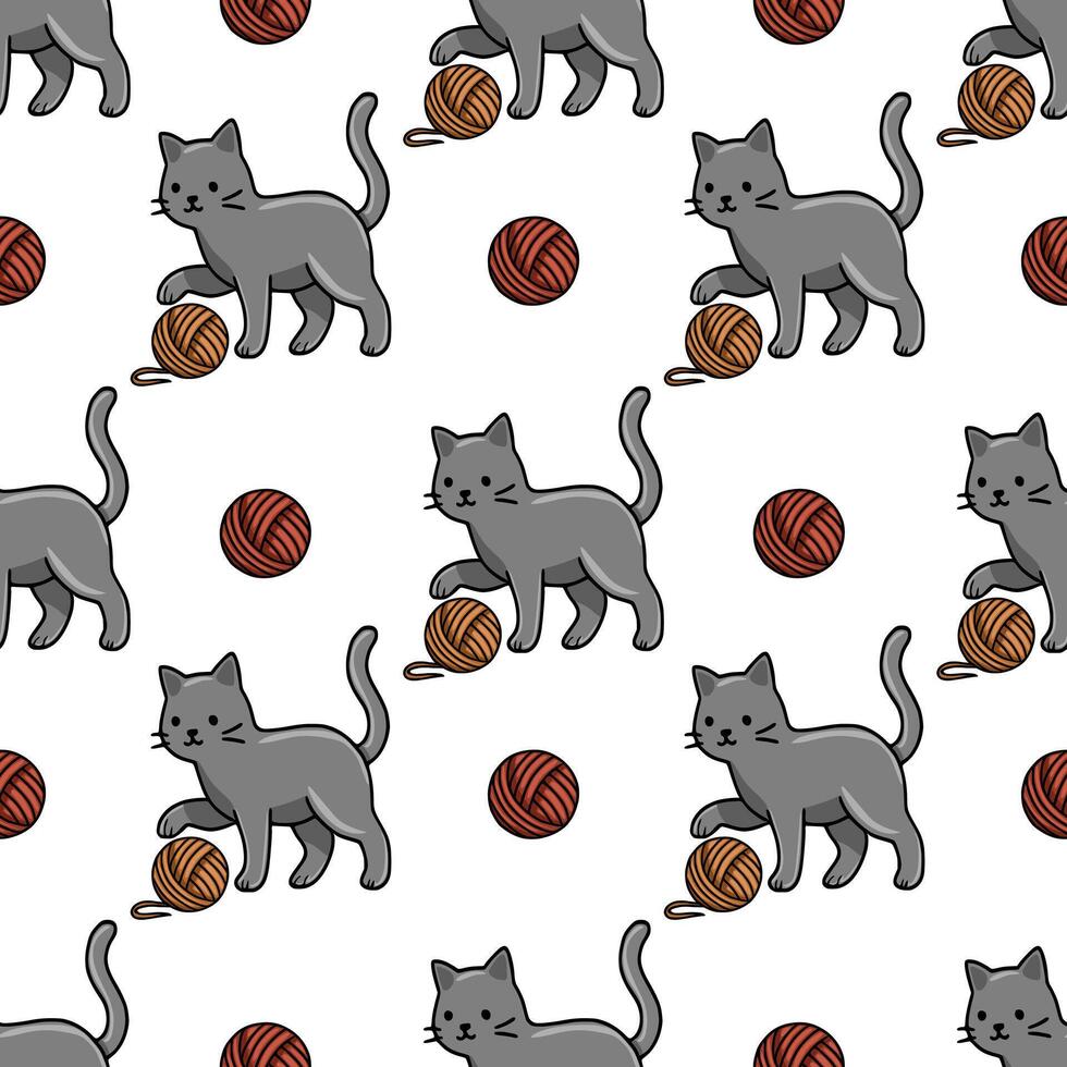 Seamless pattern featuring playful grey cats interacting with balls of yarn in brown and red hues, creating a charming and repetitive design. Pro Vector