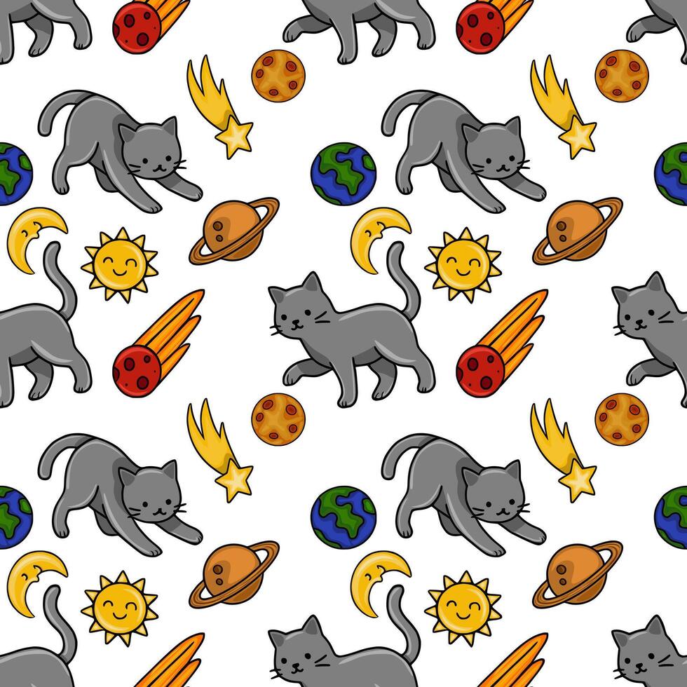 Seamless pattern featuring adorable grey cats playfully interacting with cartoon planets, stars, comets, and a smiling sun, creating a whimsical and joyful cosmic scene. Pro Vector