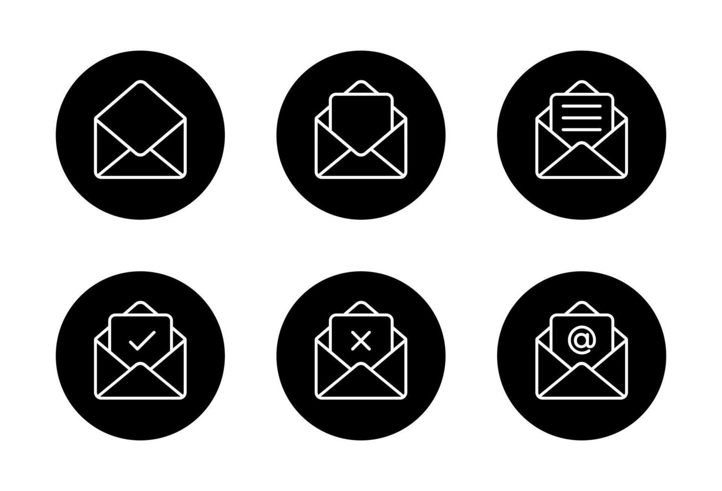 Open email envelope outline icon in black circle. Message symbol with check, cross, text, and mention sign Pro Vector