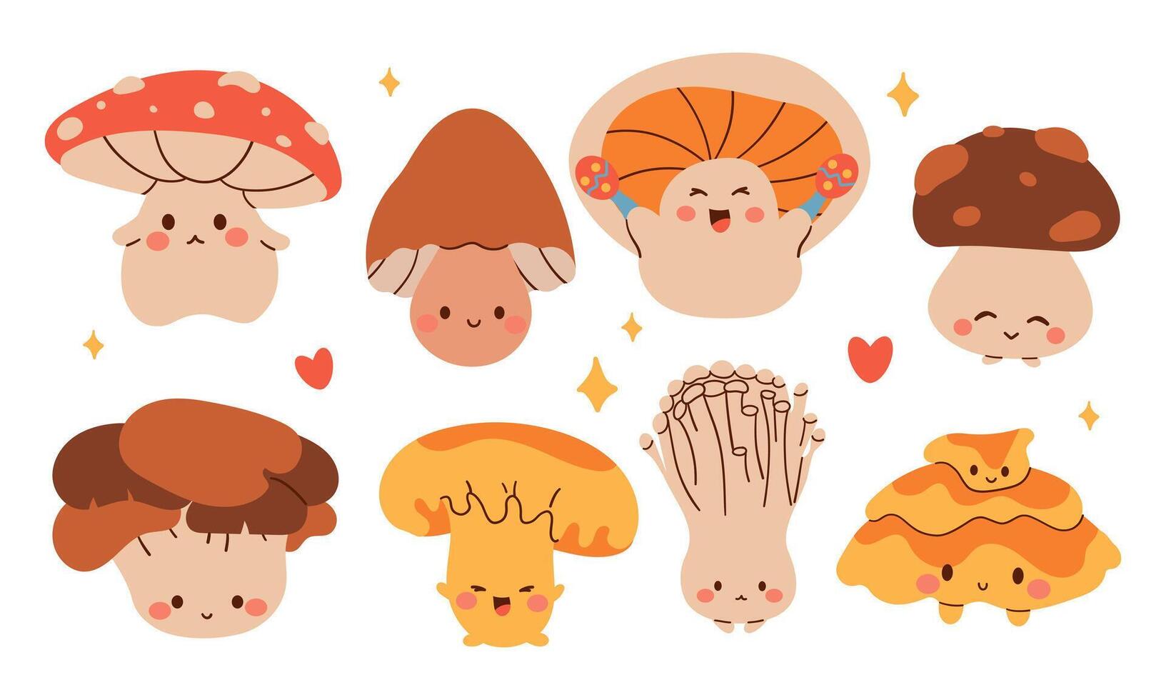 Various mushroom characters. Funny cartoon hero. Hand drawn flat style. drawing. Cute Collection of design elements isolate on white . Pro Vector