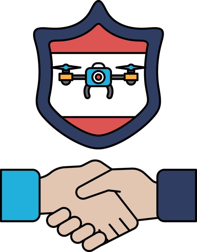 A white and black image of two hands shaking with a drone in the background Pro Vector