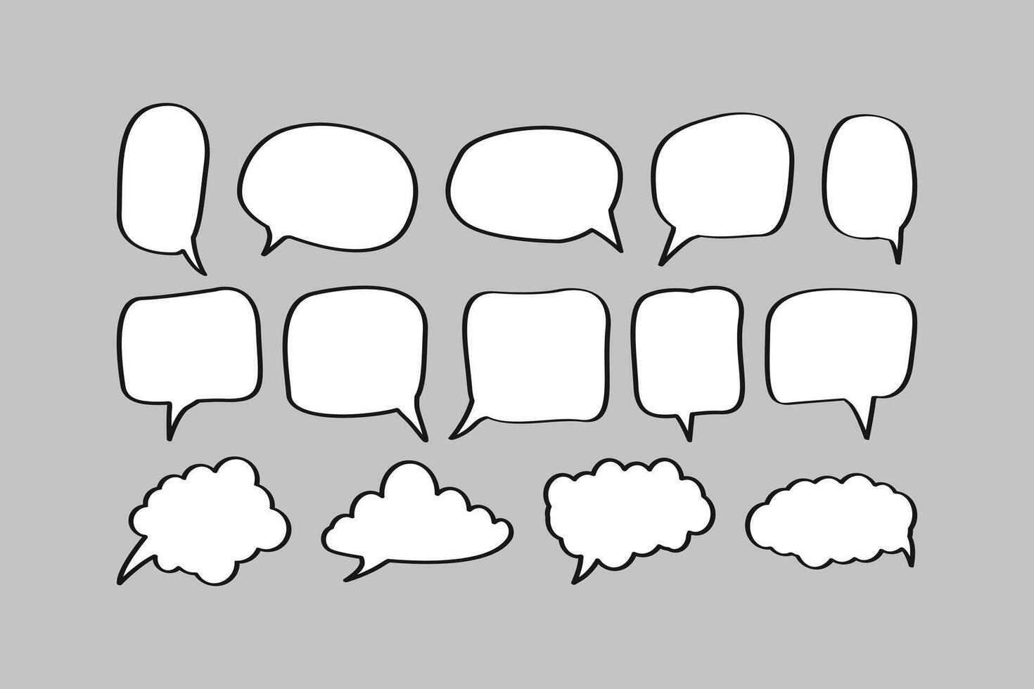 A set of fifteen diverse hand-drawn speech and thought bubbles with a bold, black outline on a gray background. Includes different shapes like clouds, ovals, and squares, ideal for comics and dialogue Pro Vector