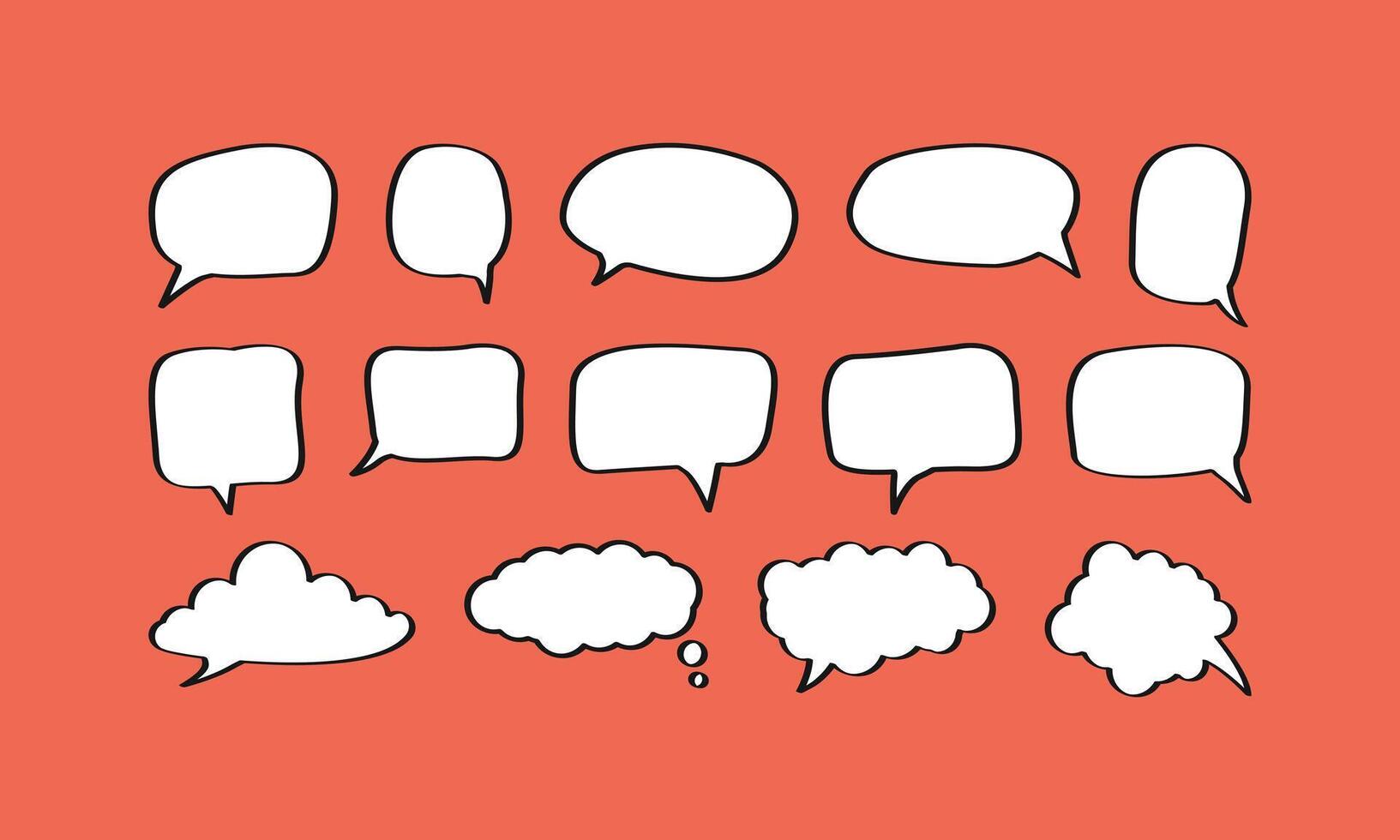 A set of fifteen diverse hand-drawn speech and thought bubbles with a bold, black outline on a vibrant coral background. Includes different shapes like clouds, ovals, and squares Pro Vector