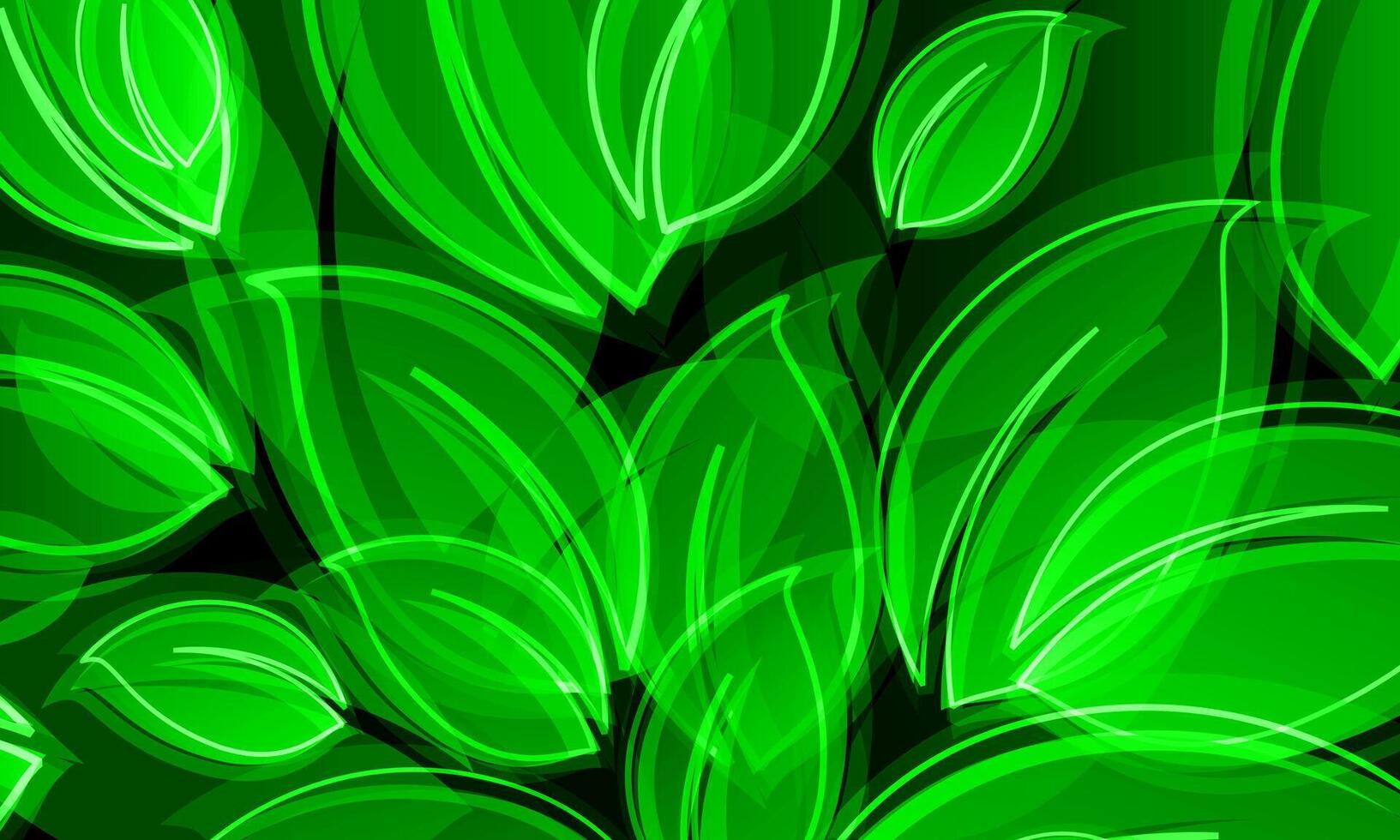 Abstract glowing green leaves background. overlapping leaf shapes with neon-style outlines and smooth curves. natural background. Pro Vector
