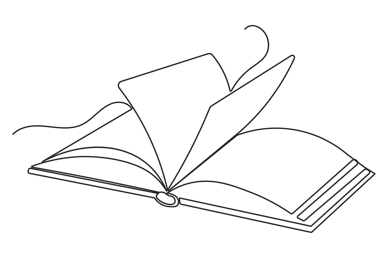 Minimal style open book with flying pages continuous one line drawing isolated sketch Pro Vector