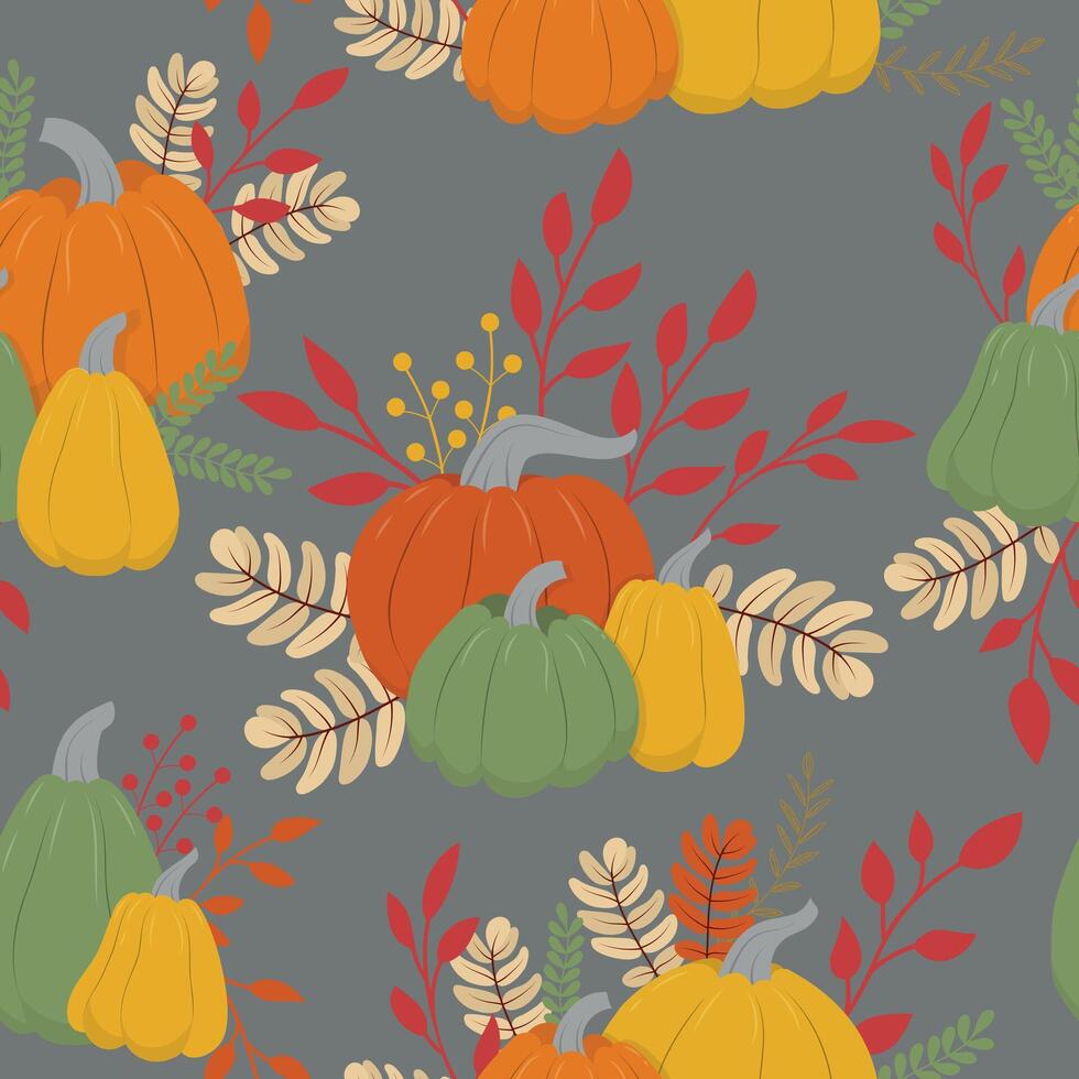 Seamless fall fall pattern with leaves and pumpkins in flat style on grey background Pro Vector