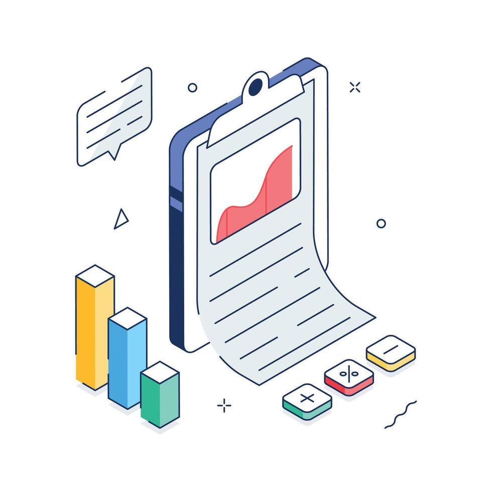 Market report isometric illustration with clipboard and data charts Pro Vector