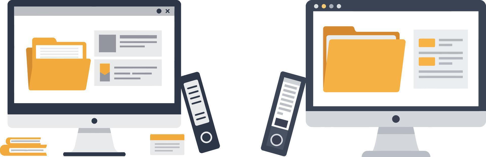 Two computers displaying digital folders and files with binders on desk. Pro Vector