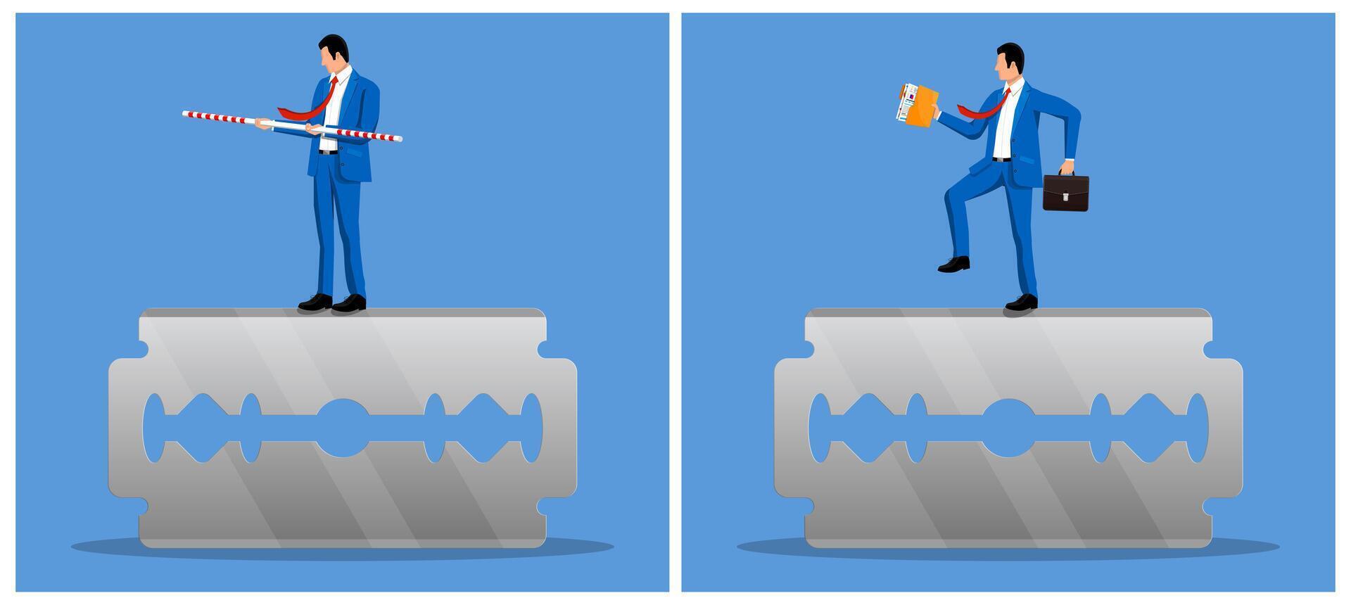 Businessman Balancing on a Razor Blade Illustration Pro Vector
