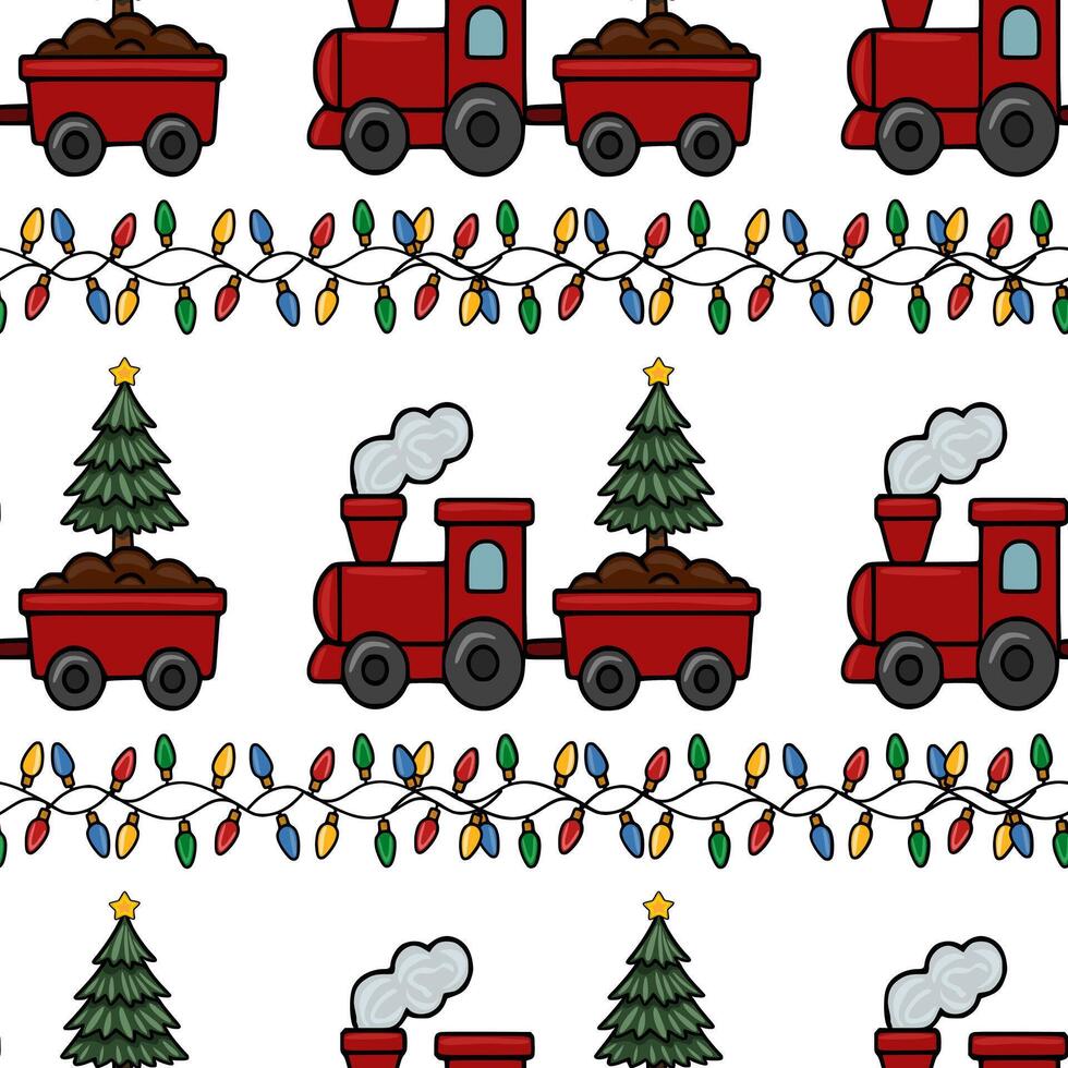 Seamless pattern featuring a whimsical Christmas train carrying Christmas trees, interspersed with festive string lights, creating a charming and playful holiday design. Pro Vector