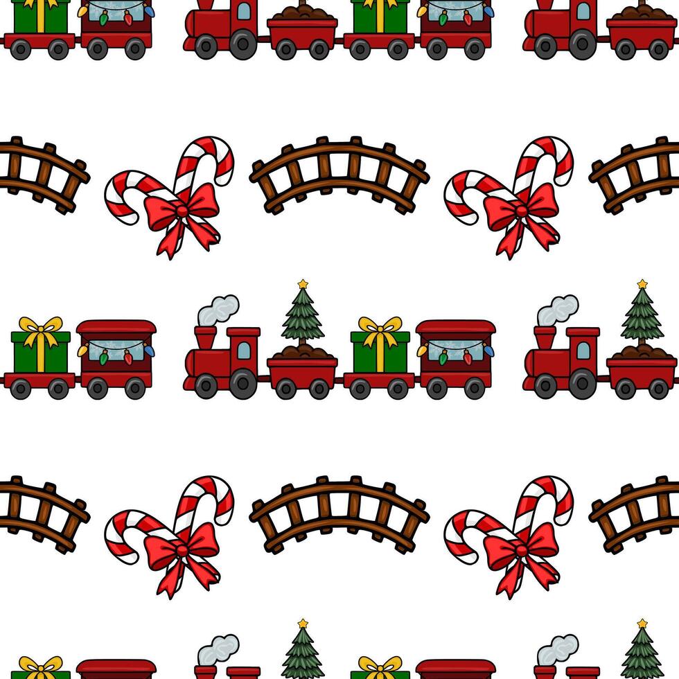 Seamless pattern featuring a charming Christmas train carrying gifts and a Christmas tree, interspersed with candy canes and a railway bridge, creating a festive and playful design. Pro Vector