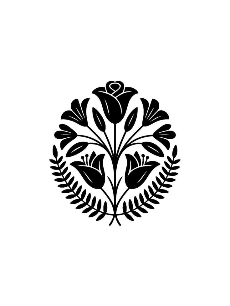 A sophisticated floral crest featuring a central rose surrounded by stylized lilies and laurel branches arranged in a symmetrical circular emblem on a clean background Pro Vector