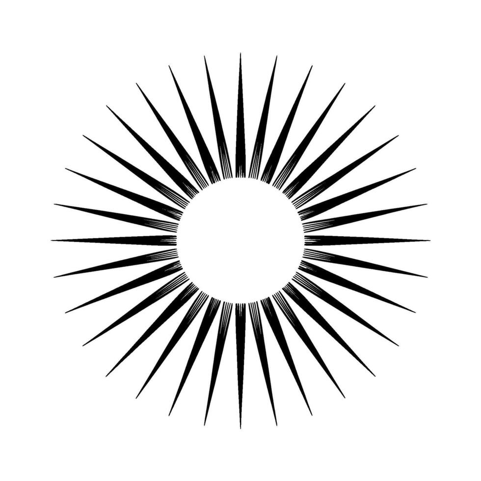 A stark illustration of a stylized sunburst with sharp radiating lines emanating from a central light circle against a pale grey background Pro Vector