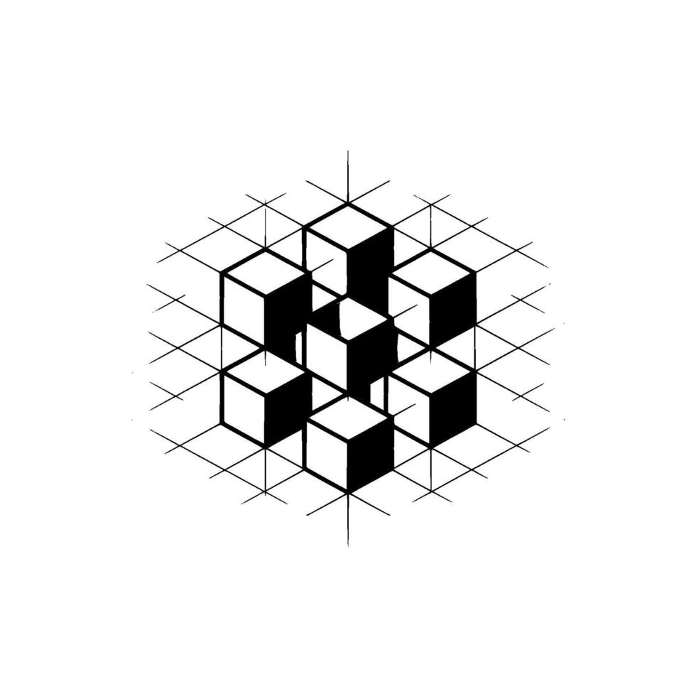 A stark geometric abstract illustration featuring a cluster of nine isometric cubes arranged in a three by three grid with outlines against a subtle light grey textured background and intersecting fin Pro Vector
