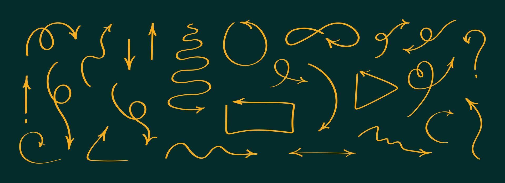 Arrow doodles and hand drawn sketch elements, swirl and curve lines, direction icons and highlight arrows set Pro Vector