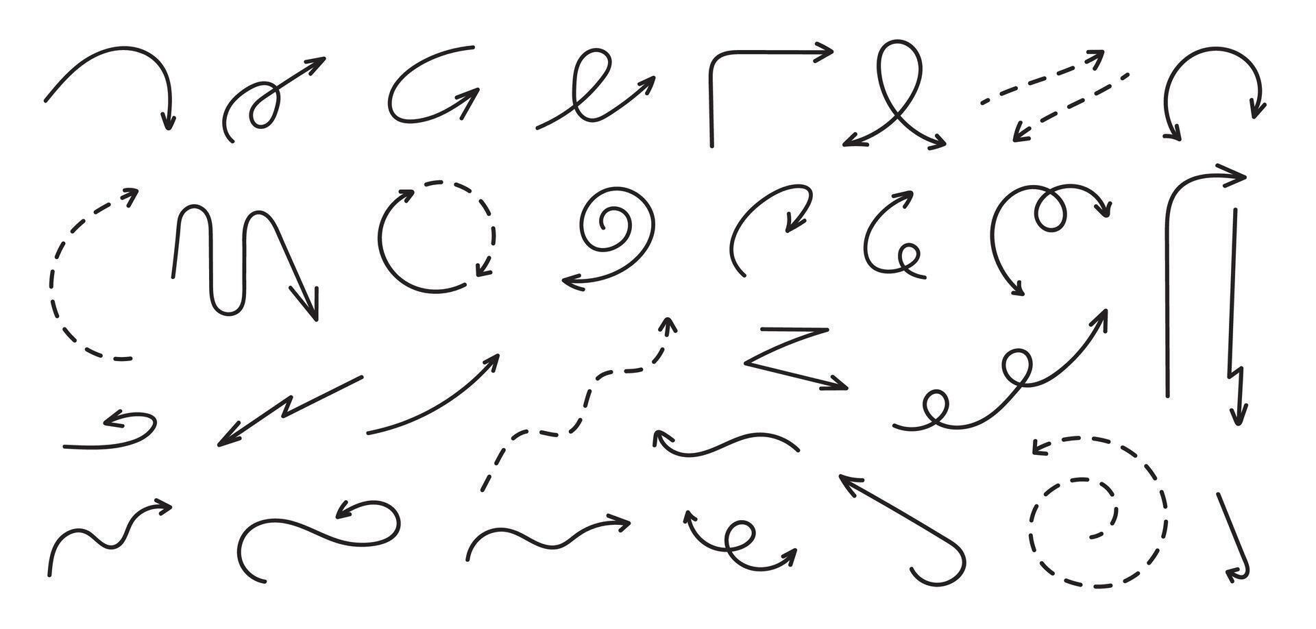 Hand drawn arrows in curved, dashed, spiral, wavy shapes with black marker or pen style. Directional arrow doodle elements. Isolated line sketch arrowhead pointers set Pro Vector