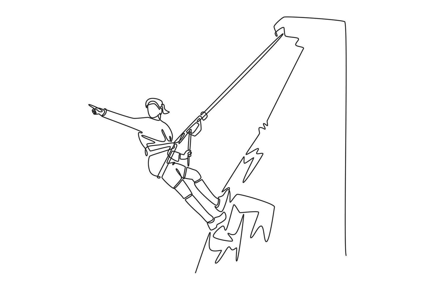 Continuous one line drawing young man is pointing forward while rappelling, embodying a thrilling hobby, athletic skill, and motion of the descent. Single line draw design graphic illustration Pro Vector