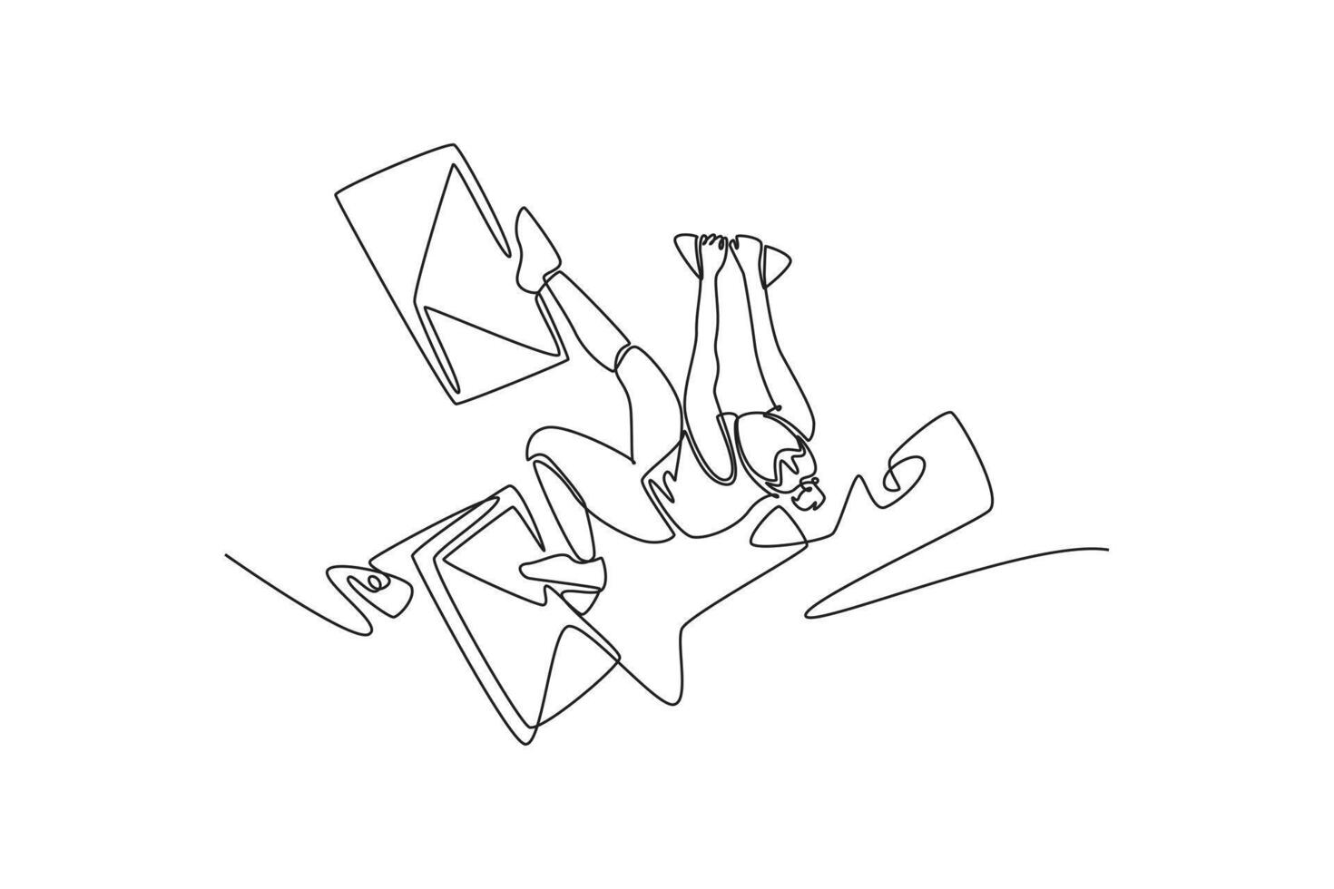 Single continuous line drawing female climbing overhanging cliff in challenging, inverted pose, representing courage required to conquer a rock wall. One line draw graphic design illustration Pro Vector