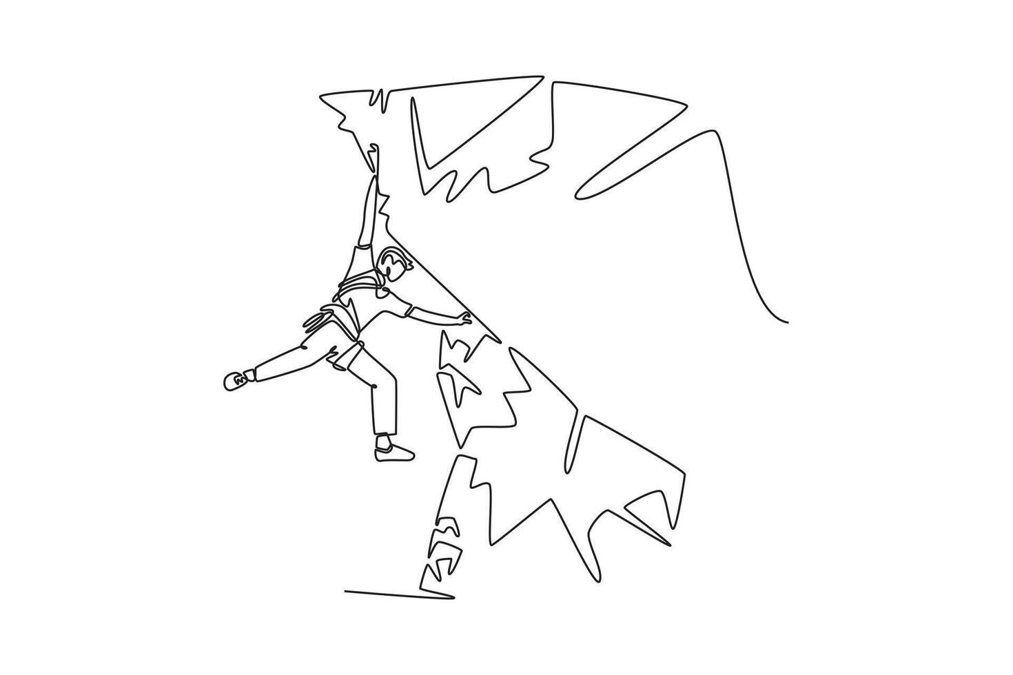 Continuous one line drawing brave man climbing a steep cliff, symbolizing adventure, strength, determination, and the thrill of a difficult ascent. Single line draw design graphic illustration Pro Vector