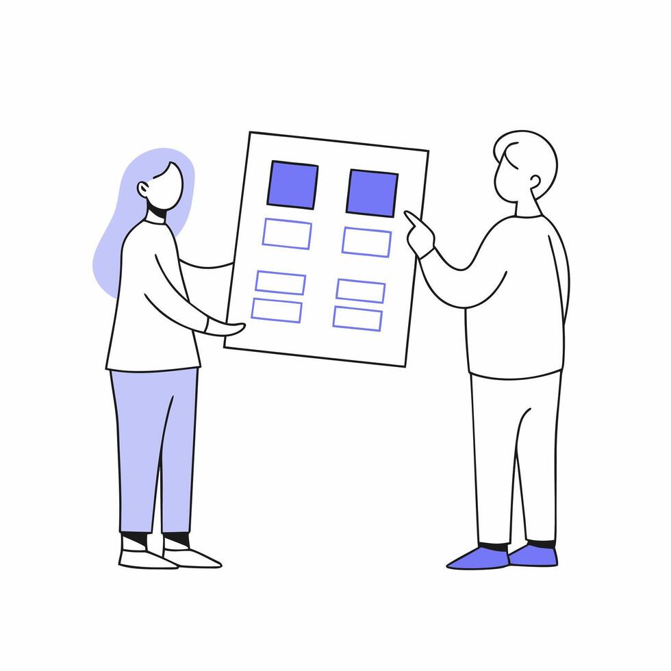 Startup team reviewing performance metrics and growth graphs. Minimalistic illustration Pro Vector