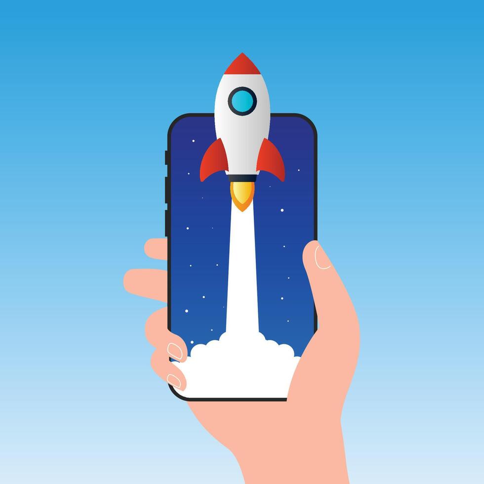 Concept of the startup and project development, with spaceship and mobile phone. Flat illustration of a spaceship and a smartphone Pro Vector