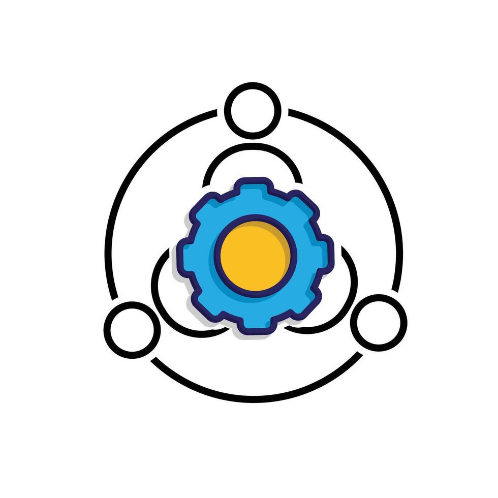 Teamwork icon. Management. Three silhouettes of people gathered in a circle with a gear in the middle. office, analysis. Mixed design style. Pro Vector