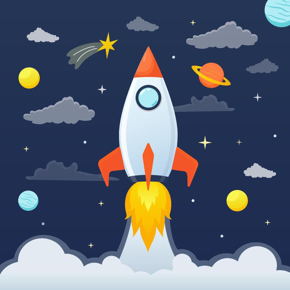 Spaceship launching in the outer space with planets and stars Pro Vector