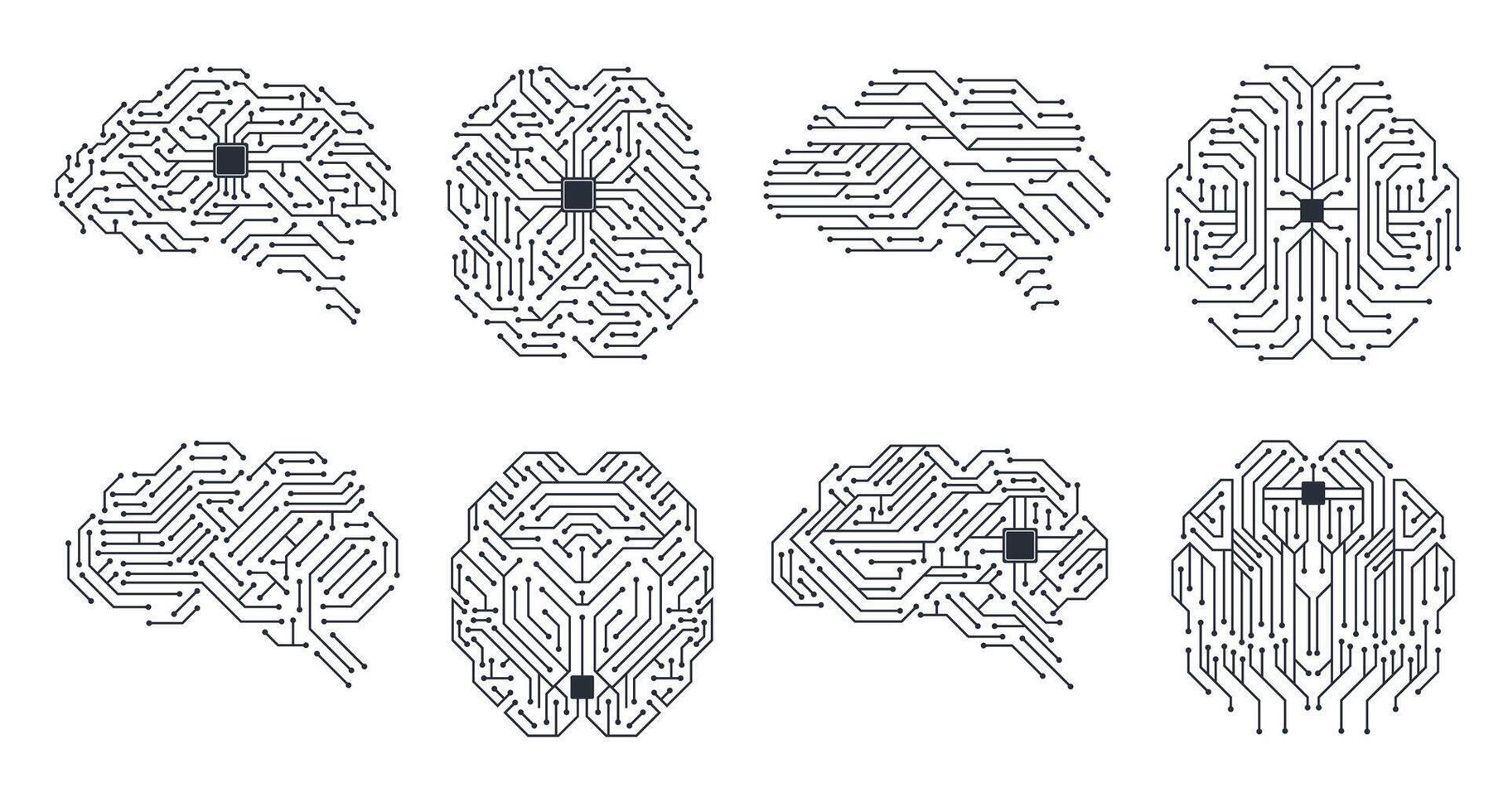 Circuit board brain. Technical thinking concept with microchip brain, brain with electronic circuitry. cyberpunk human brain isolated on white background Pro Vector