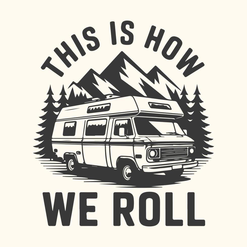 Art of retro camper van parked in front of mountains and pine trees with the text this is how we roll Pro Vector