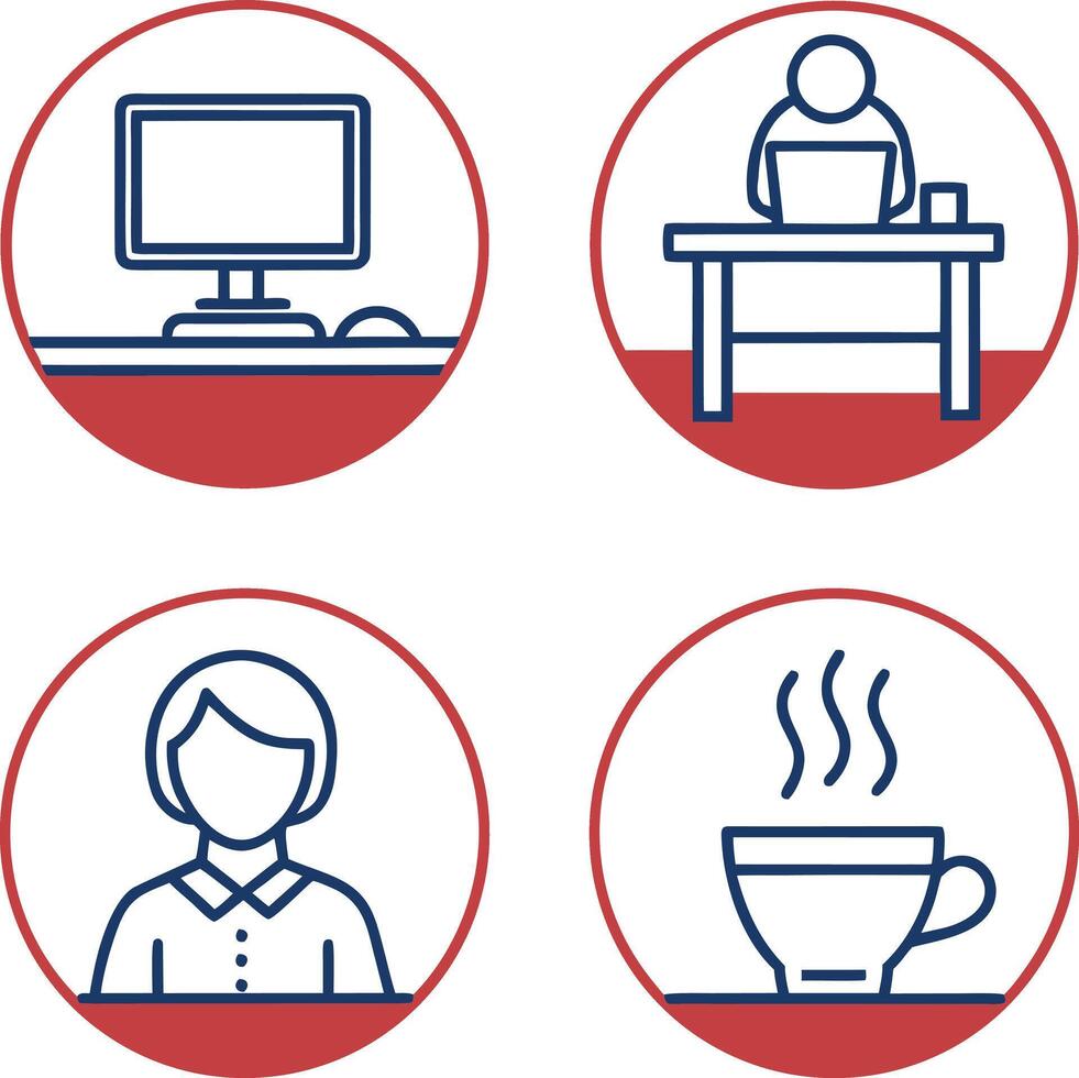Four icons of people working at a desk, coffee, and a computer Pro Vector