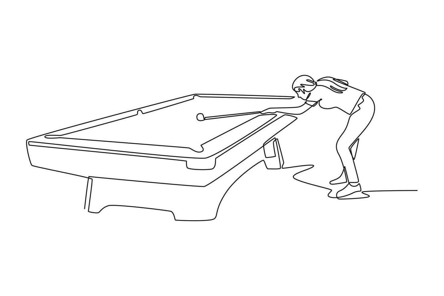 Single continuous line drawing attractive female in a low, focused stance, aiming a shot on pool table. Precision, strategy, and concentration of game. One line draw graphic design illustration Pro Vector