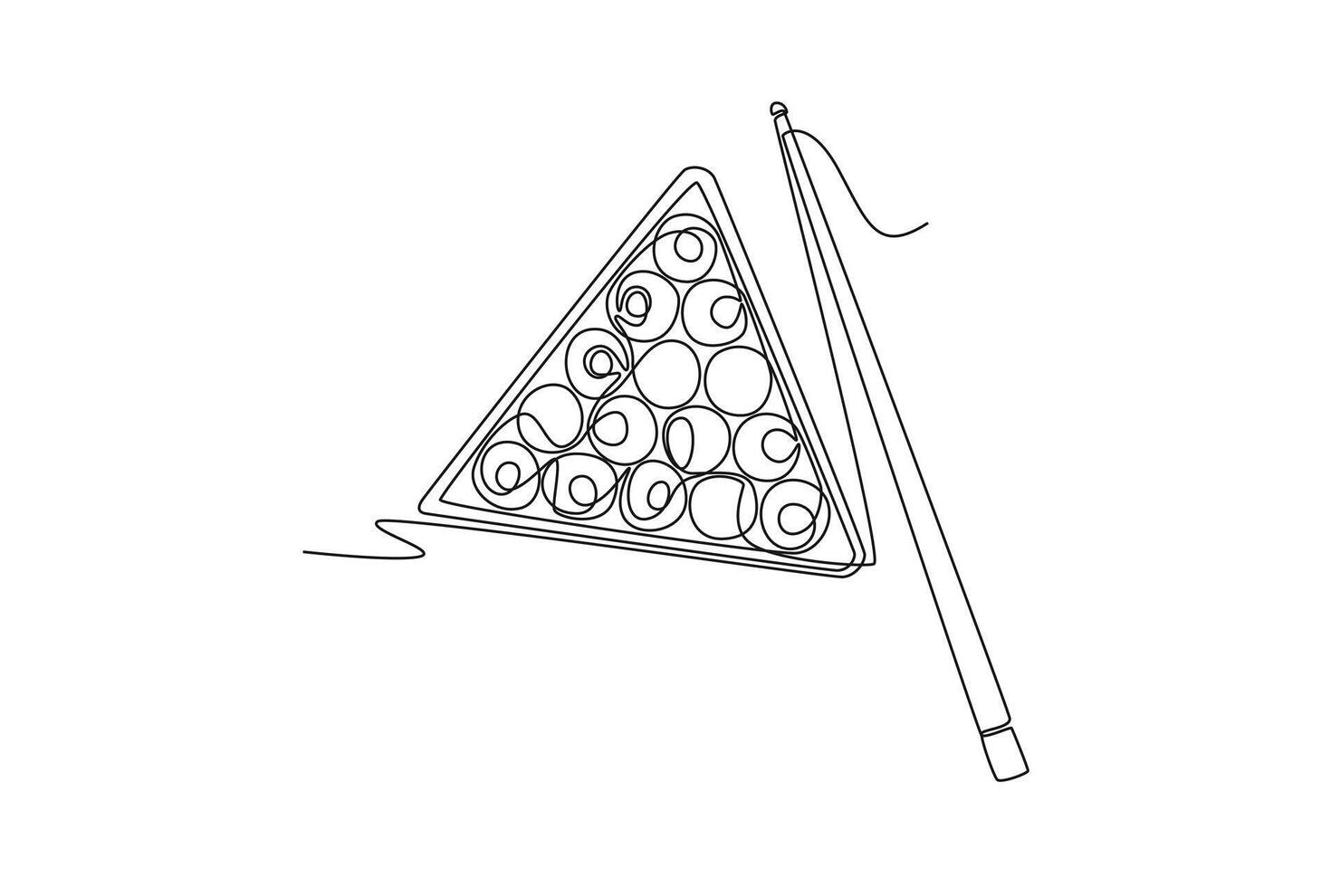 Single one line drawing rack of billiard balls and a cue stick, symbolizing strategic start and poised anticipation of new game of pool. Modern continuous line draw design graphic illustration Pro Vector